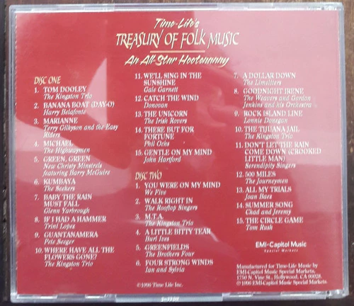 Various – Time Life's Treasury Of Folk Music - An All-Star Hootenanny - Volume One Selo: Time Life Music – R132-22, EMI-Capitol Music Special Markets – 72438-19158-2-0 Formato: 2 x CD, Compilation País: US Lançado: 1996 Genre: Folk, World, & Country Estilo: Folk