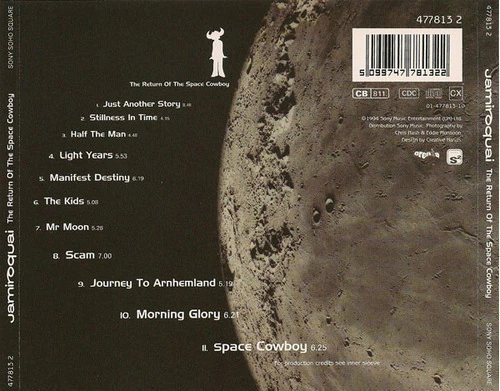 • The Return Of The Space Cowboy - the first release of this album: 'Cowboy' is seen in upper case on the front page of the booklet; the booklet includes individual band member photos & names, and no 3-panel group photo; also excludes thanks from Derrick. The disc shows '( See booklet for details )', disc matrix '01-477813-10' and no SIDs.