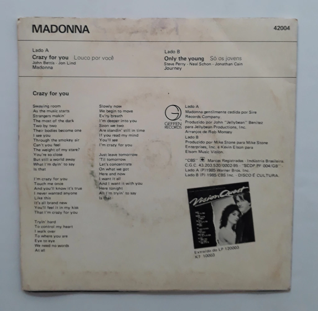 The lyrics to Madonna's Crazy For You are printed on the back sleeve, but intriguingly it has an extra verse added to the lyrics, suggesting that originally Crazy For You had three verses!