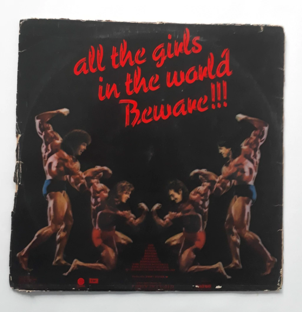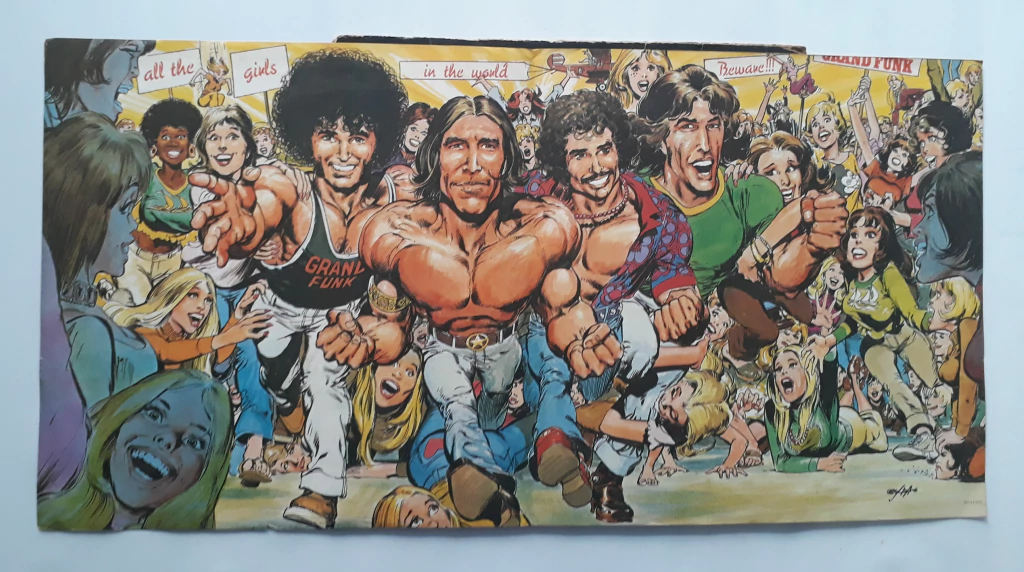 The inside sleeve included an illustrated poster of the body builders surrounded by a crowd of females, which was illustrated by Neal Adams.