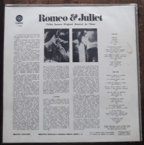 LP raro Nino Rota – Romeo & Juliet Raro condição da mídia: VG+ Ano: 1969 País: Brasil Lista de faixas A1 Robert Stephens – Prologue And Prince (Act I, Scene 1) 2:46 A2a Leonard Whiting– Romeo's Foreboding (Act I, Scene 4) 1:52 A2b Glen Weston– Song: "What Is A Youth" 2:43 A2c Leonard Whiting, Olivia Hussey– Feast At The House Of Capulet (Meeting Of Romeo And Juliet) (Act I, Scene 5) 2:22 A2d Glen Weston– Song: "What Is A Youth" 0:27 A3 Leonard Whiting, Olivia Hussey– The Balcony Scene (Act II, Scene 2) 9:26 B1 Milo O'Shea, Leonard Whiting, Olivia Hussey– Romeo & Juliet Are Wed (Act II, Scene 6) 3:00 B2 John McEnery, Leonard Whiting, Bruce Robinson (6), Michael York (2), Robert Stephens (2), Natasha Perry, Antonio Pierfederici– The Death Of Mercutio And Tybalt (Act III, Scene 1) 3:36 B3 Olivia Hussey, Leonard Whiting, Pat Heywood– Farewell Love Scene (Act III, Scene 5) 4:21 B4 Olivia Hussey, Milo O'Shea– The Likeness Of Death (Act IV, Scene 1) 2:36 In Capulet's Tomb (Death Of Romeo & Juliet) 7:22 B5a Milo O'Shea, Paul Hardwick– Act IV, Scene 5: Juliet's Chamber B5b Leonard Whiting, Keith Skinner– Act V, Scene 1: Mantua B5c Leonard Whiting, Milo O'Shea, Olivia Hussey– Act V, Scene 3: The Tomb B6 Robert Stephens – All Are Punished (Act V, Scene 3) 2:07